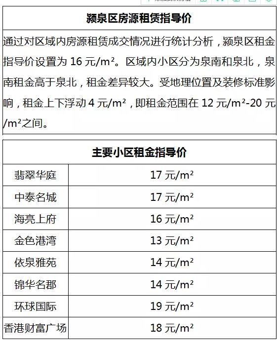 4月16日,阜阳市房地产管理局公布2018年第一季度阜阳市城区房屋租金指导价信息,具体如下: