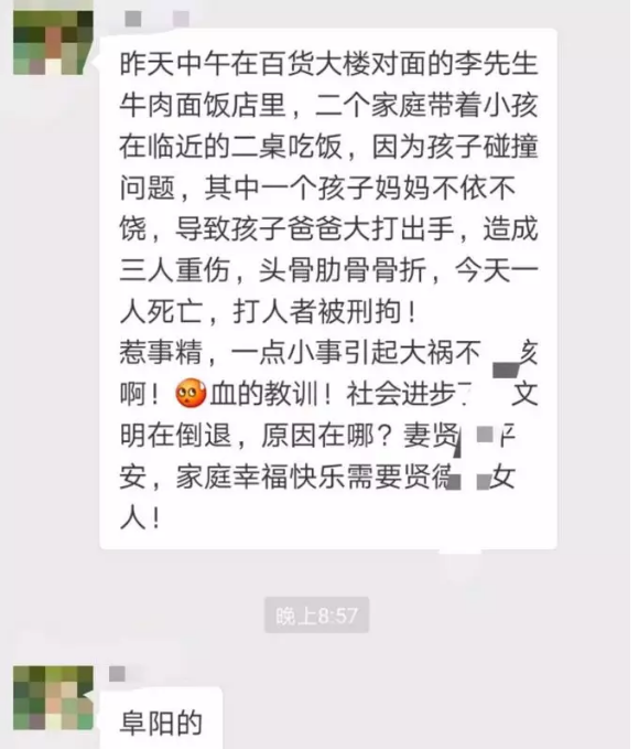 说是有两家人在阜阳百货大楼对面的李先生牛肉面饭店吃饭,因为孩子碰撞问题,双方大打出手,三人受重伤,一人死亡,打人者还被刑拘了。
