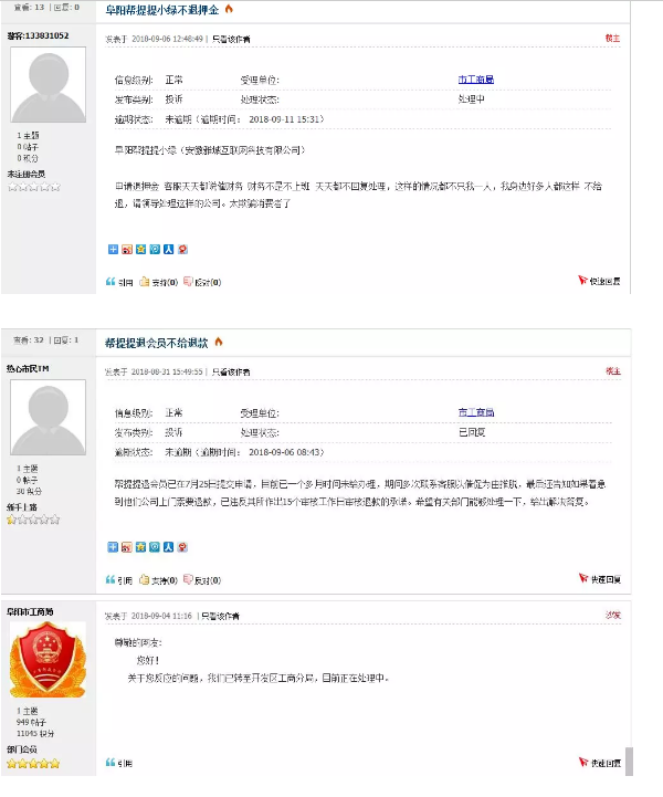 最近,阜阳的网友又开始扎推投诉,看来帮提提退押金难已经为不少市民诟病,市工商局在阜阳市政府门户网站【在线访谈】平台.再次回应了帮提提不退押金的问题.