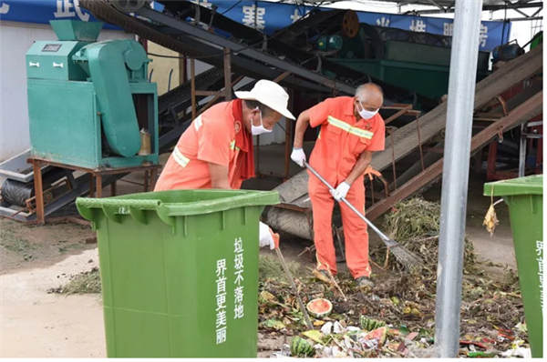 随后,几名环卫工忙碌起来,将收集来的垃圾进行二次分类,能回收的拣出来集中堆放,不可降解的堆在一处,剩余的菜叶、瓜果皮、剩饭等留在原地。