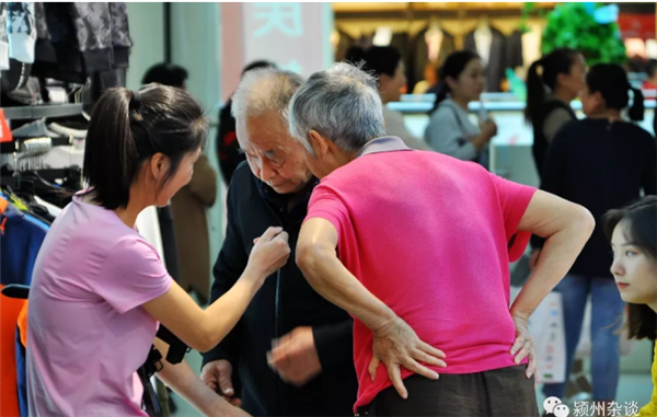 在营业员的帮助下,老人们终于挑选好了一身运动服,穿在老头子身上,看似比较合适,但老伴似乎还有点不太放心,她一边帮老头子拉上拉链,一边问道,褂子衣服合身吗。