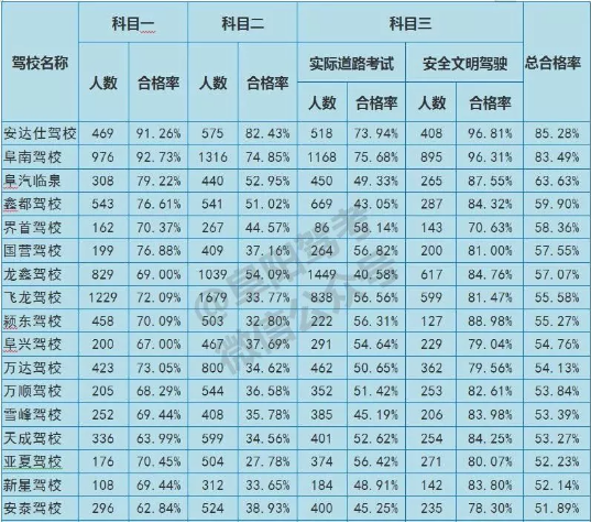 2018年11月份全市驾驶员培训学校考试质量情况通报如下:参加科目一理论考试共计11157人次,合格8154人,合格率73.08%;参加科目二场地考试共计19379人次,合格7791人,合格率40.2