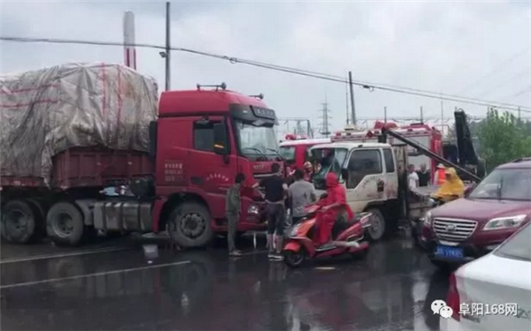 8月17日下午16时许,106国道太和县双浮镇加油站旁一辆大货车与小货车相撞,两车头部不同程度受损,小货车内一人被困。小货车上司机的妻子被困车中。消防员立即使用液压破拆工具将副驾驶一侧车门卸下,实施救