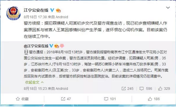 昨日下午15:23分,新浪微博认证为南京市公安局江宁分局新浪微博社区委员会专家成员的@江宁公安在线 发布了一则警方通报《阜阳一对夫妻在南京市江宁区被人持刀砍杀身亡》,具体内容如下。2018年8月18日