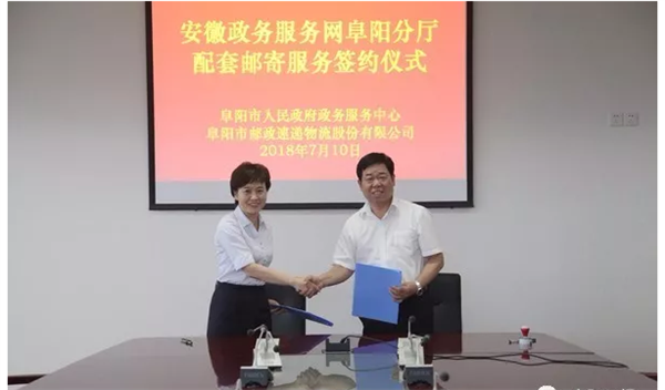近日,市政务服务中心和市邮政速递物流公司举行安徽省政务服务网阜阳分厅配套邮寄服务项目签约仪式。今后,市民到市政务服务中心办理事项,办理的各类证照、审批结果等可以免费邮寄到家。经过前期的系统对接和测试运